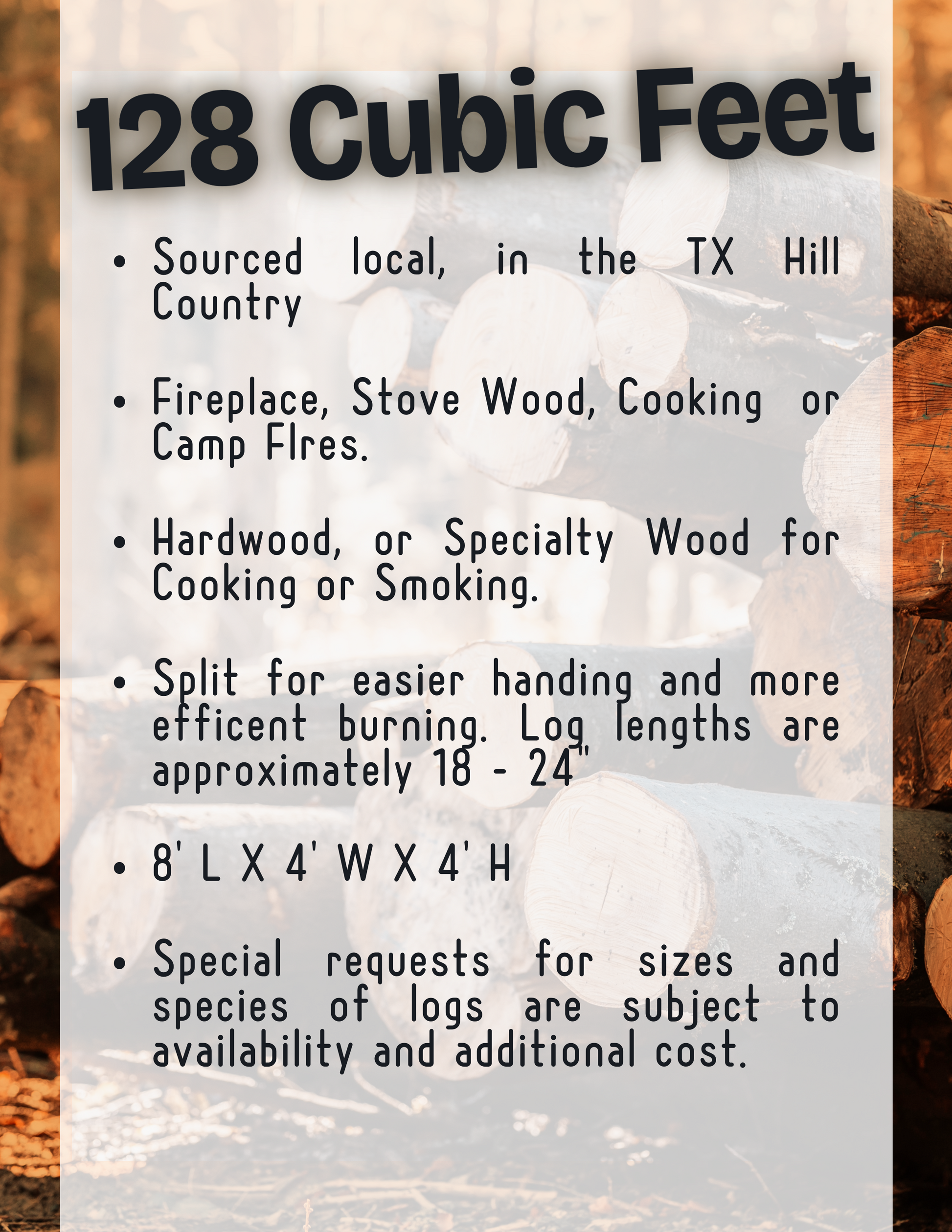 Indulge in the superior quality of Texas Hill Country Pecan Firewood. Known for its dense, slow-burning properties, our hand-split pecan wood delivers consistent heat and a long-lasting, captivating flame. Elevate your fireside experience with the unmatched performance of premium Texas pecan.
